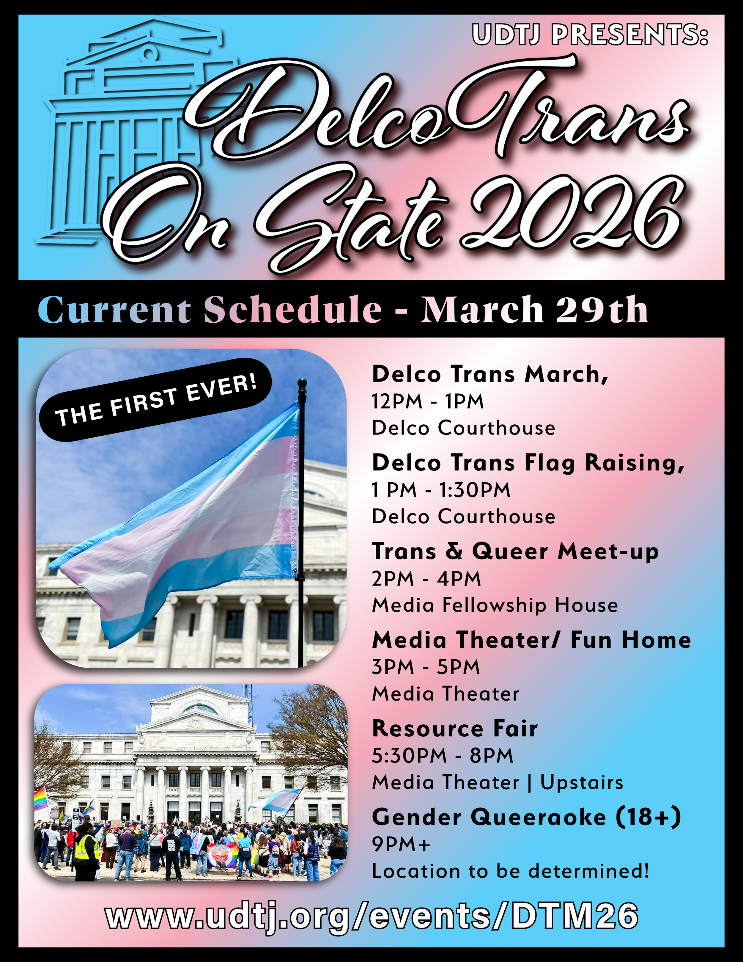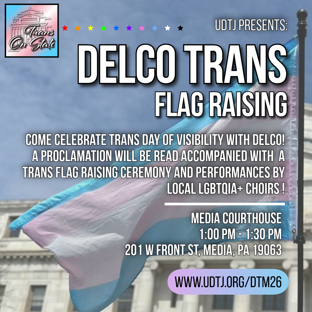 The day begins with the Delco Trans March at 12:00 PM at the Delaware County Courthouse. We will gather as a community to march for visibility, dignity, and trans rights.